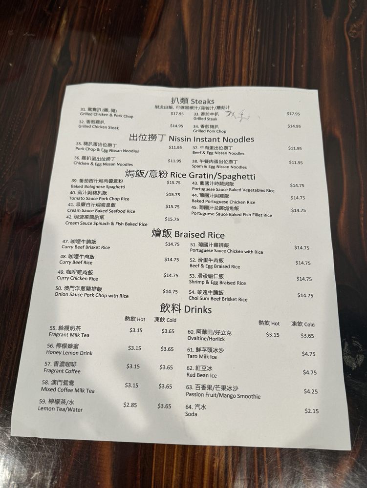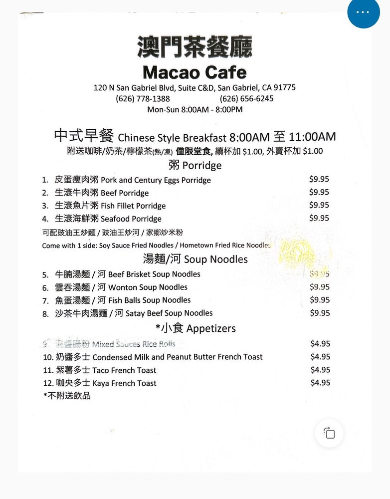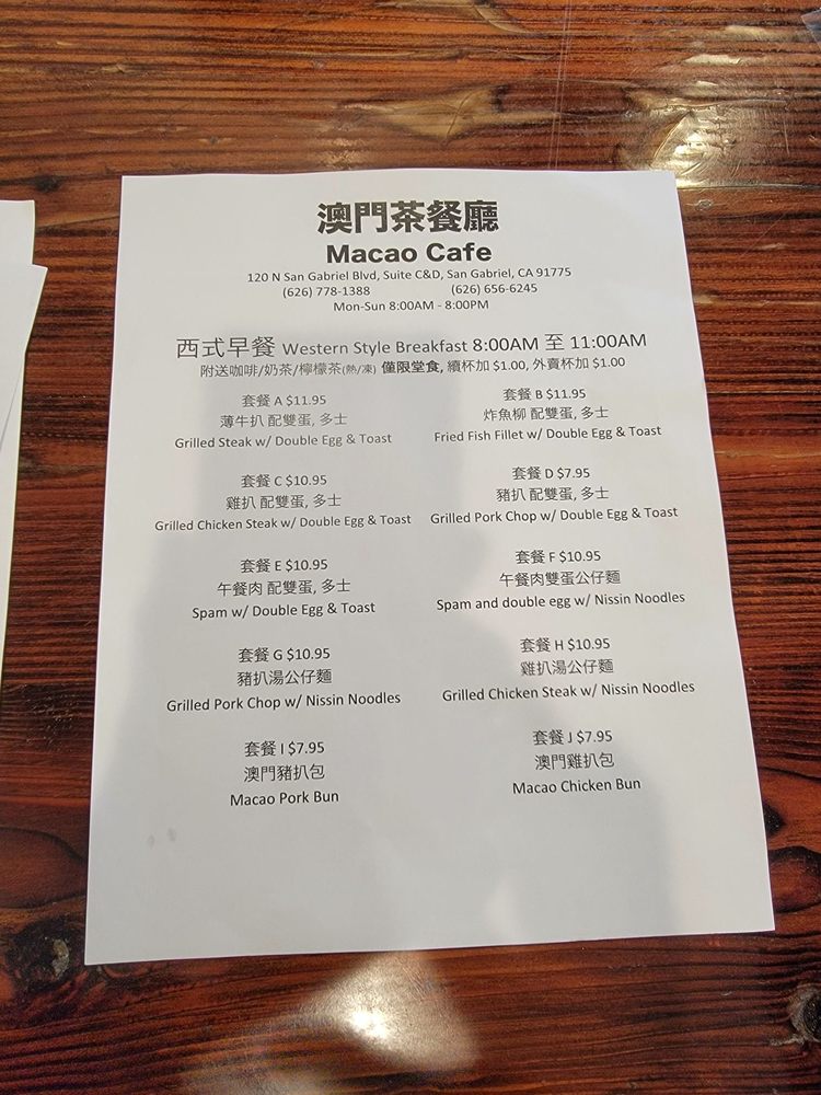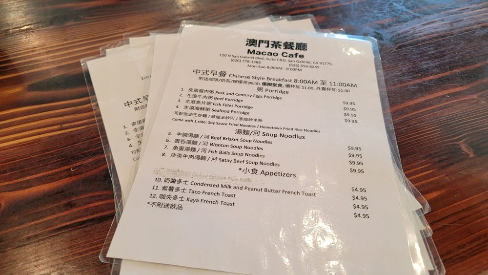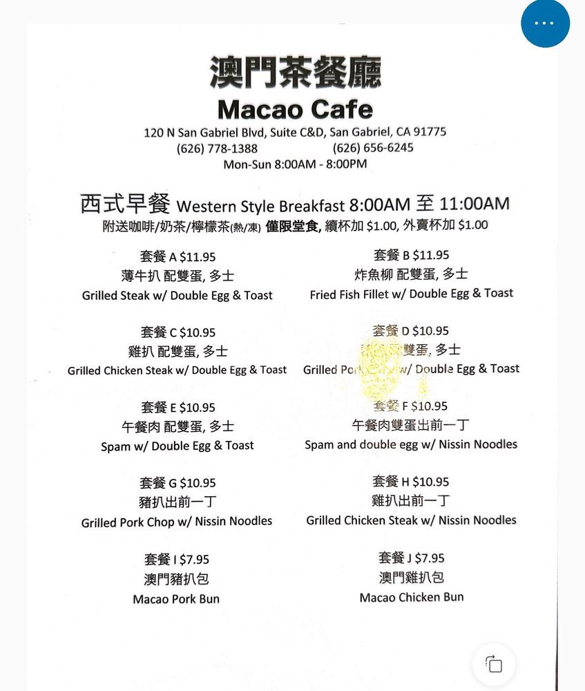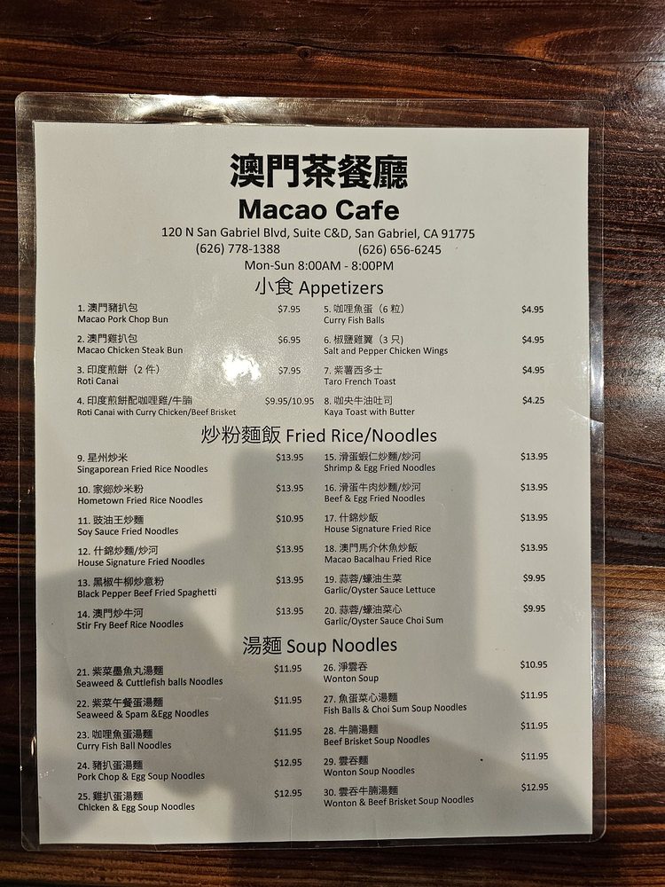 Introducing Macao Cafe, a hidden gem in San Gabriel offering a variety of Hong Kong-inspired dishes. Known for their flavorful noodles, the menu features must-try options like Beef Brisket Soup Noodles and Hometown Fried Rice Noodles. Customers praise the friendly service and comfortable seating, making it a perfect spot for lunch or dinner. The Curry Fish Balls and Salt and Pepper Chicken Wings are popular appetizers, while the Beef Cubes with Red Rice and Chicken Wings with Salted Egg receive rave reviews. With afternoon tea specials available seven days a week, Macao Cafe is a cozy spot to enjoy comforting dishes like Chicken Steak and Instant Noodles. Don't miss out on their delicious food and generous portions when you visit this charming cafe.